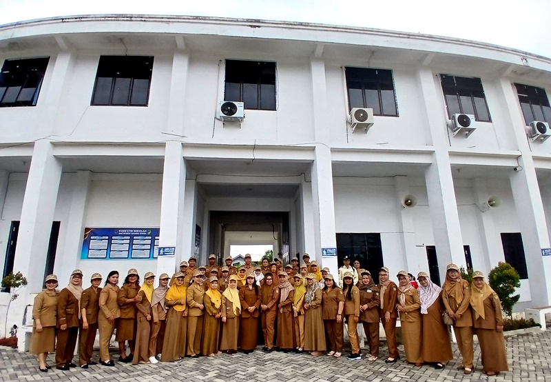 FOTO BERSAMA KEPSEK-Usai apel Senin, para dewan guru foto bersama dengan kepala SMPN 1 Muara Teweh, Maslan, S.Pd.I, di halaman sekolah, Senin (30/3/2026).(Media Dayak/Ist)