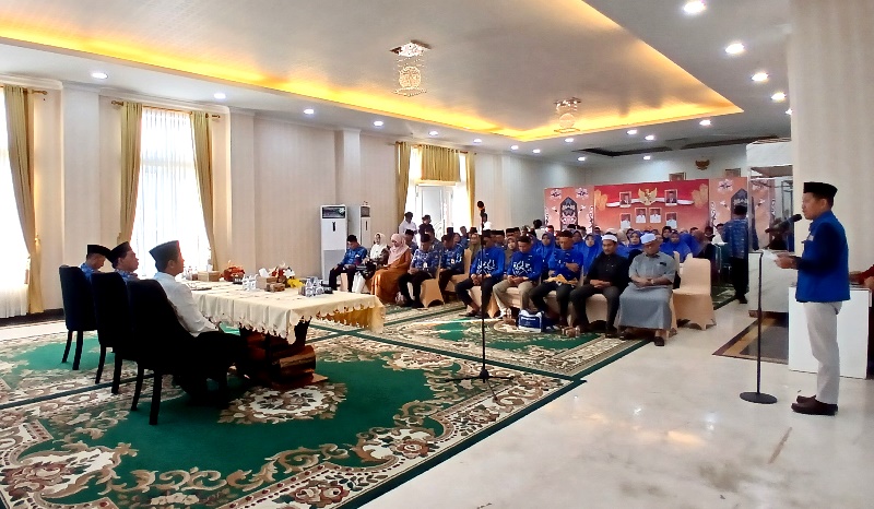 Romiadi selaku perwakilan Agen PT Haramain Toyyibah Wisata (HTW) Muara Teweh sekaligus tour leader menyampaikan laporan kegiatan pelepasan Jamaah Umroh juara MTQH ke 33 tahun 2025 di Rumah Jabatan Bupati, Rabu (25/3/2026).(foto:Media Dayak)