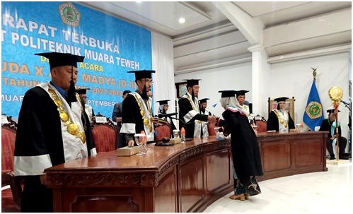 Sebanyak 49 orang mahasiswa dan mahasiswi Politeknik Muara Teweh (Poltek Mtw) mengikuti wisuda X tahun 2022, di gedung Balai Antang Muara Teweh, Kamis (29/09). Ke 49 orang mahasiswa ini resmi mendpat gelar Diploma atau Sarjana Muda.