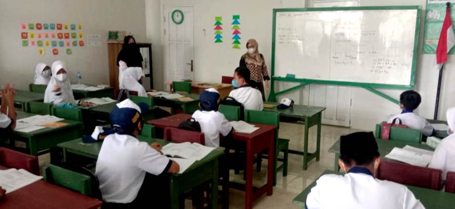 PELAJARAN ALJABAR-Bunda PAUD Barito Utara Hj Sri Hidayati menyempatkan diri memberi pelajaran Aljabar kepada siswa dan siswi SMP Muhammadiyah saat melakukan kunjungannya di SMP tersebut, Selasa (28/9).(Media Dayak/lana)