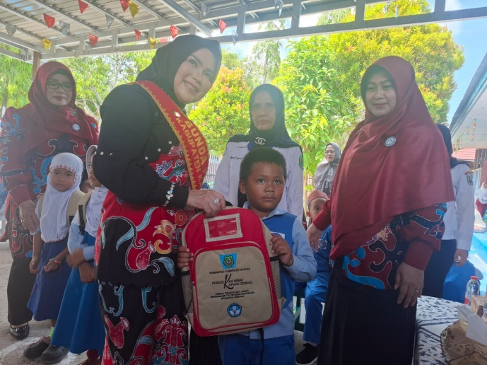 SERAHKAN – Bunda PAUD Kabupaten Kapuas Hj. Siti Saniah Wiyatno menyerahkan makanan tambahan dan tas kepada anak-anak TK Tunas Muda PKK. (Media Dayak/Hmskmf)