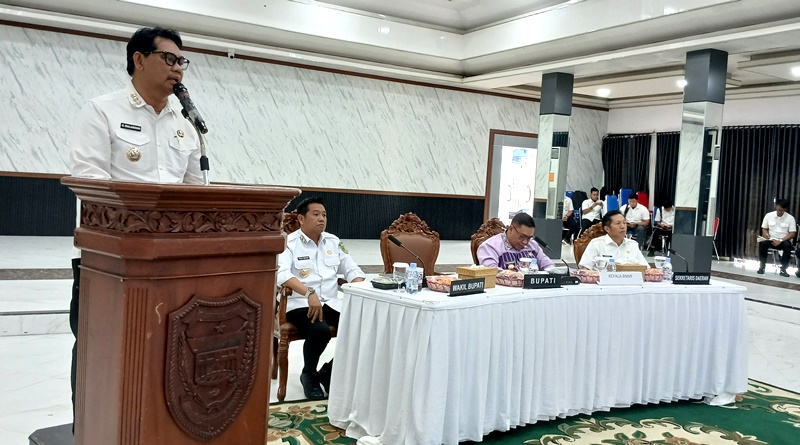 Bupati Barito Utara H Shalahuddin saat memberikan sambutan pada acara Audiensi dan Sinergi P4GN yang digelar di Gedung Balai Antang Muara Teweh, Rabu (11/2/2026).(Media Dayak:ist)