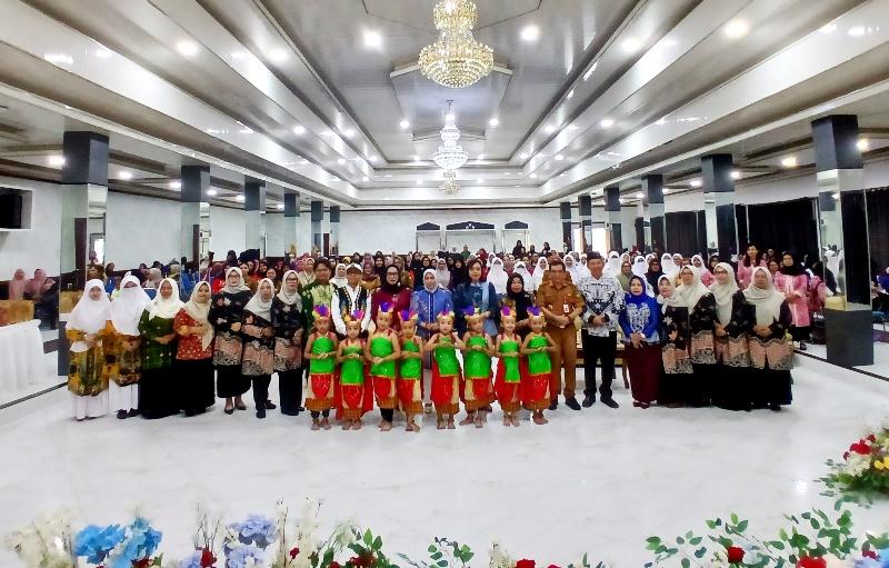 FOTO BERSAMA KETUA TP PKK-Para peserta Workshop 50 Teknik Membuka Kelas Anti Ngantuk foto bersama Ketua TP PKK Barito Utara Hj Maya Savitri Shalahuddin didampingi Kadis Pendidikan, Ketua PGRI, Ketua GOW, Ketua DWP serta undangan lainnya, usai pembukaan, di Gedung Balai Antang, Selasa (28/4/2026).(Media Dayak/Lana)