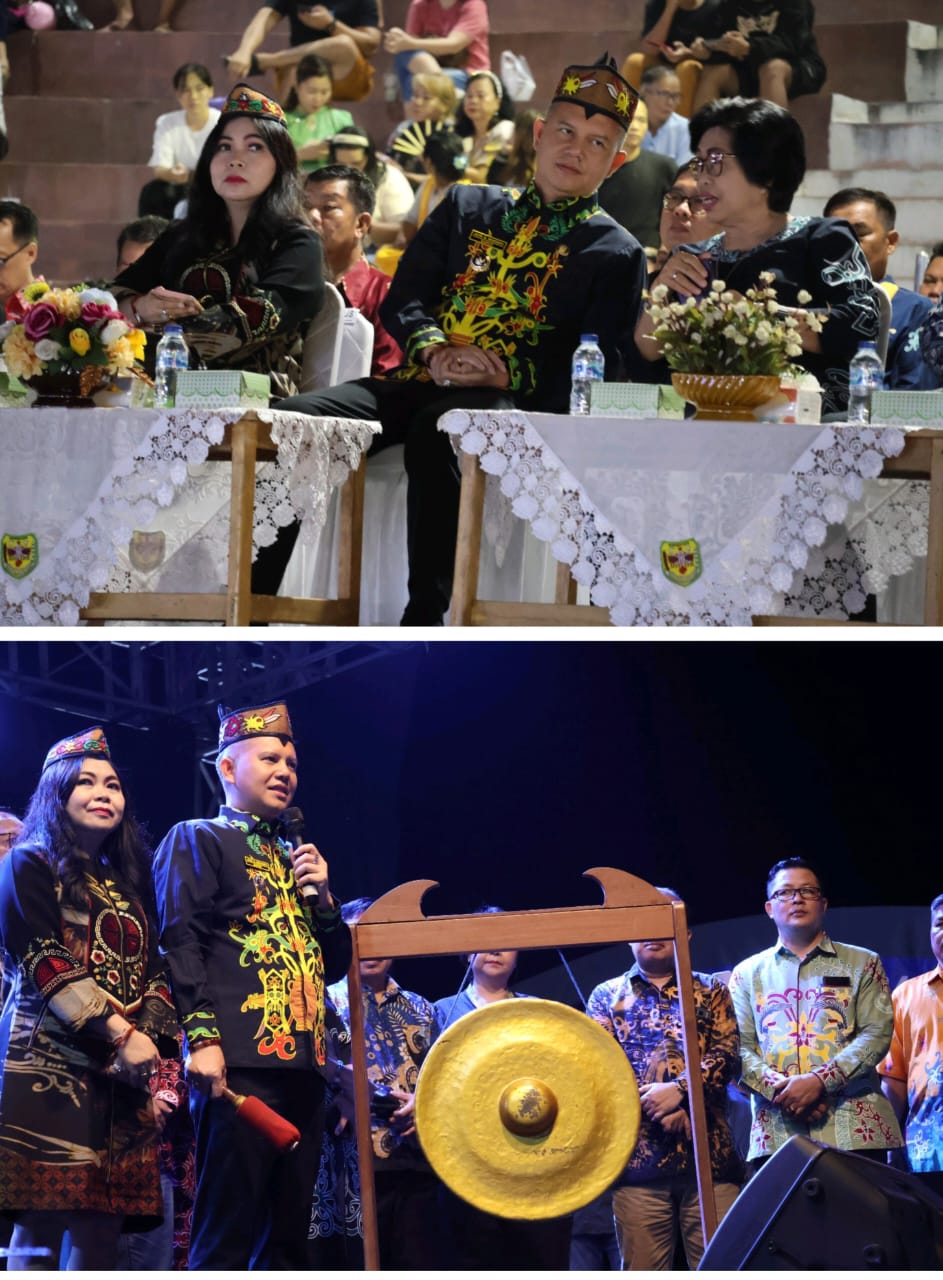 Bupati Gumas Jaya Samaya Monong didampingi Wabup Efrensia L.P Umbing dan ketua TP PKK/Dekranasda Ny.Mimie Mariatie Jaya Samaya Monong, membuka UMKM di Kompleks Stadion Mini Kuala Kurun,Kamis (12/5/2026) malam.(Media Dayak/ist)