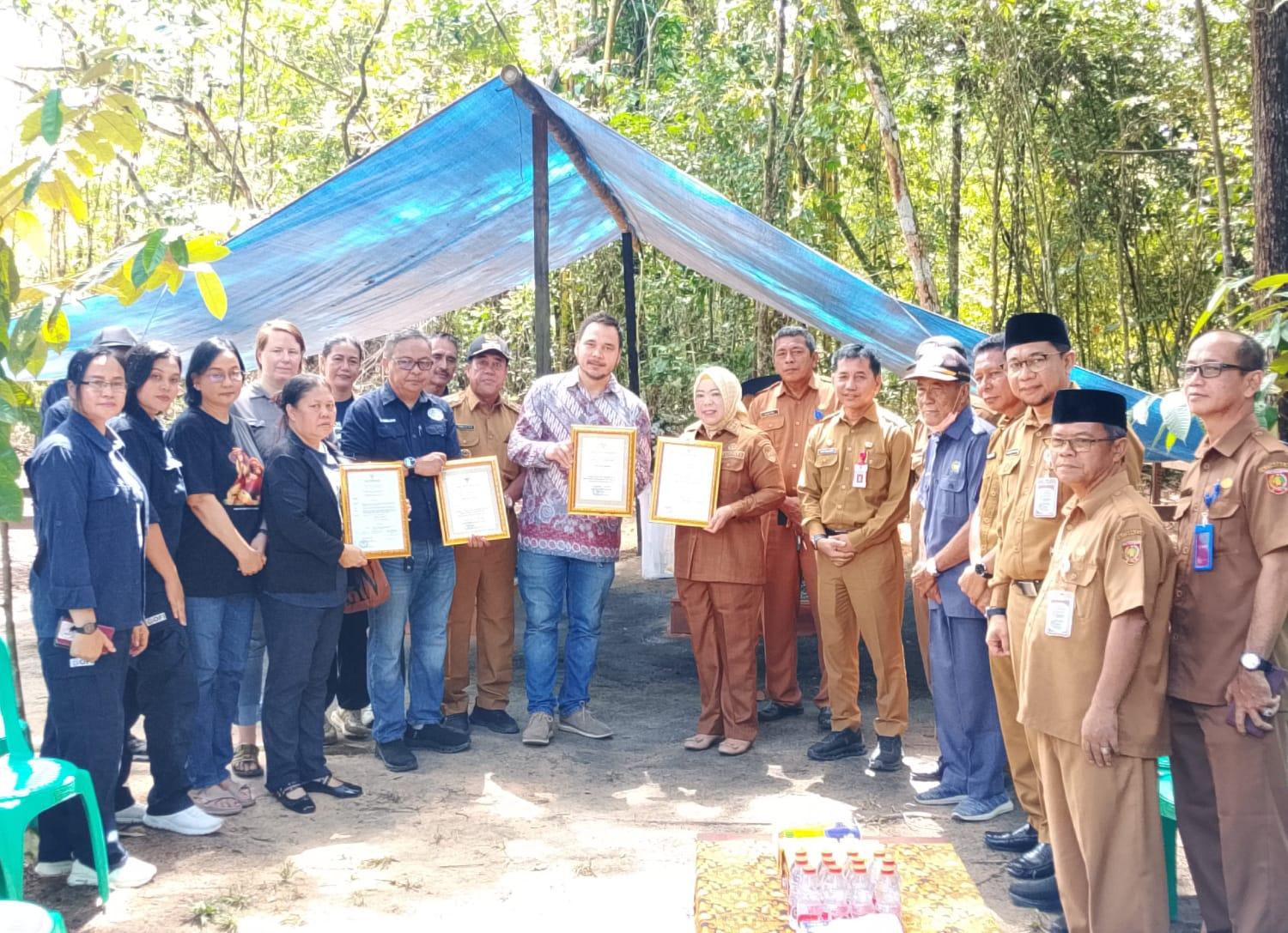 Bupati Hj. Nurhidayah menyerahkan piagam penghargaan kepada penerus keluarga Prof. Dr. Birutė Mary Galdikas dan Bohap bin Jalan saat ziarah di Desa Pasir Panjang, Senin (20/4/2026) (Media Dayak/Riduan)
