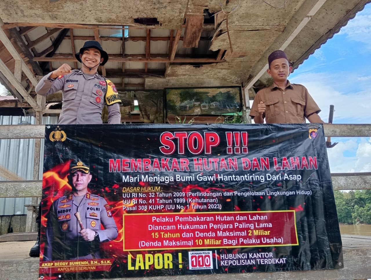 Bhabinkamtibmas Desa Ayawan, BRIPDA Akhmad Danang Pramudia, bersama staf pemerintah desa setempat melaksanakan pemasangan spanduk Karhutla (Kebakaran Hutan dan Lahan) sekaligus menyampaikan himbauan tentang larangan pembakaran hutan dan lahan di Dermaga Ferry Penyebrangan Desa Ayawan, Kecamatan Seruyan Tengah, Selasa (7/4/2026) pagi. Kegiatan yang berlangsung mulai pukul 08.00 WIB ini menyasar masyarakat Desa Ayawan.
