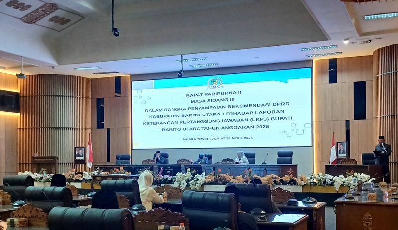 Dewan Perwakilan Rakyat Daerah (DPRD) Kabupaten Barito Utara menggelar Rapat Paripurna II Masa Sidang III dalam rangka penyampaian rekomendasi DPRD terhadap Laporan Keterangan Pertanggungjawaban (LKPJ) Bupati Barito Utara Tahun Anggaran 2025, Jumat (24/4/2026) di gedung DPRD setempat.