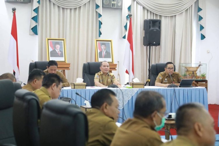 Gubernur Kalteng Agustiar Sabran didampingi Wagub dan Plt Sekda Kalteng saat memimpin rapat di Istana Isen Mulang, Rumah Jabatan Gubernur Kalteng, Senin (23/2/2026)(Biro Adpim)