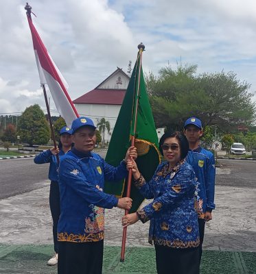 Wabup Efrensia L.P Umbing menyerahkan lambang daerah kepada Kadis Kebudayaan dan Pariwisata Hansli Gonak pada pelepasan kontingen Gumas untuk mengikuti FBIM tingkat Provinsi Kalteng di Halaman Kantor Bupati, Jumat (17/5). (Media Dayak/Novri JKH)