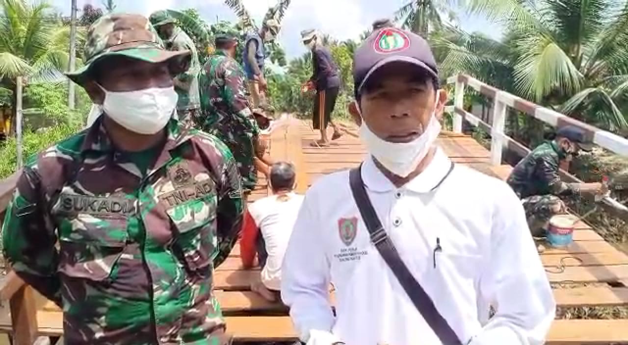 Kepala Desa Bapinang Hilir, Bahriansyah bersama Satgas TMMD Reguler ke-109 yang sedang merampungkan perbaikan jembatan