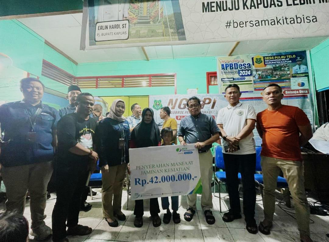 Pemerintah Kabupaten (Pemkab) Kapuas bersama BPJS Ketenagakerjaan atau BPJAMSOSTEK Kantor Cabang Kapuas menyerahkan secara simbolis santunan Jaminan Kematian (JKM) kepada ahli waris dari almarhum ibu Jainah, pekerja rentan desa Pulau Telo yg didaftarkan Pemkab Kapuas melalui anggaran APBD dan APBdes.