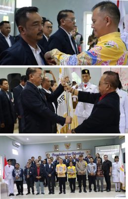 Bupati Gumas Jaya Samaya Monong memasangkan PIN KONI kepada Ketua Harian KONI Hendra Toendan (atas). Ketua Harian KONI Kalteng M.Hasanudin menyerahkan bendera KONI kepada Ketua KONI Gumas terpilih Richard (Tengah). Bupati Gumas Jaya Samaya Monong didampingi Wabup Efrensia LP Umbing serta unsur forkopimda bersama pengurus KONI 2024-2028 yang baru dilantik dan dikukuhkan (bawah). (Jendela Kalteng/Ist)