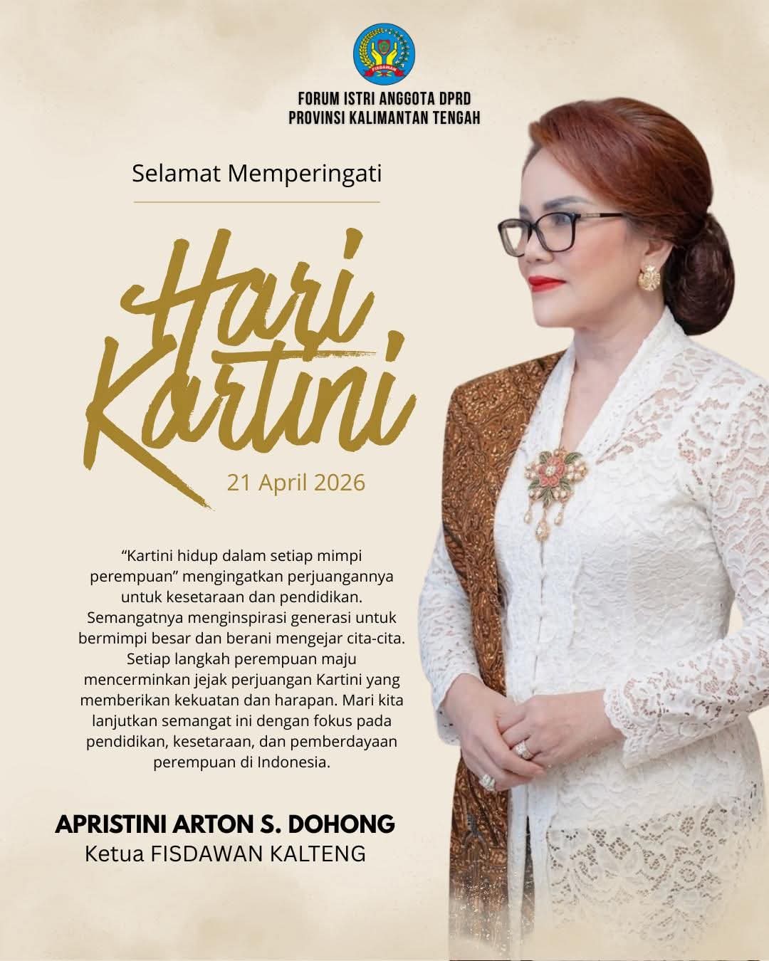 Forum Istri Anggota DPRD Provinsi Kalimantan Tengah (FISDAWAN Kalteng) turut memperingati Hari Kartini yang jatuh pada 21 April 2026 dengan mengajak seluruh perempuan untuk terus memperjuangkan pendidikan, kesetaraan, dan pemberdayaan.