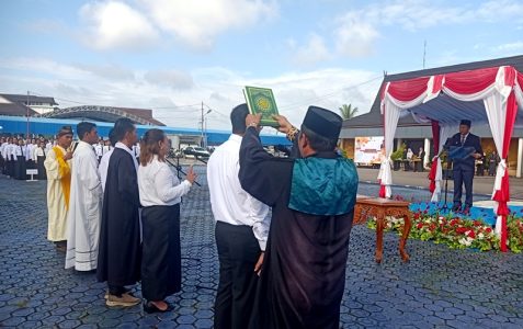 Pj Bupati Barito Utara Drs Muhlis mengambil sumpah dan janji jabatan P3K sekaligus menyerahkan Surat Keputusan (SK) sebanyak 483 orang di halaman Kantor Bupati Barito Utara, Rabu (30/4/2025).(Media Dayak:Lana)