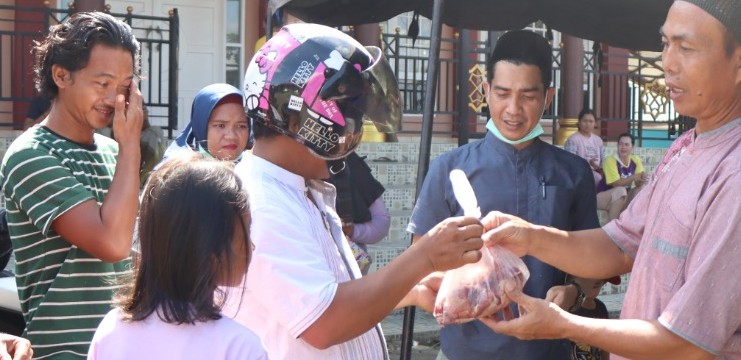 Kabag SDM Polres Katingan Kompol Sami’an saat membagikan daging qurban kepada masyarakat setempat, Minggu siang (10/7/2022) bertepatan di hari raya Iedul Adha 10 Dzulhijjah 1443 Hijriah, di halaman Masjid Al Hafiz Polres setempat.(Media Dayak/Ist)