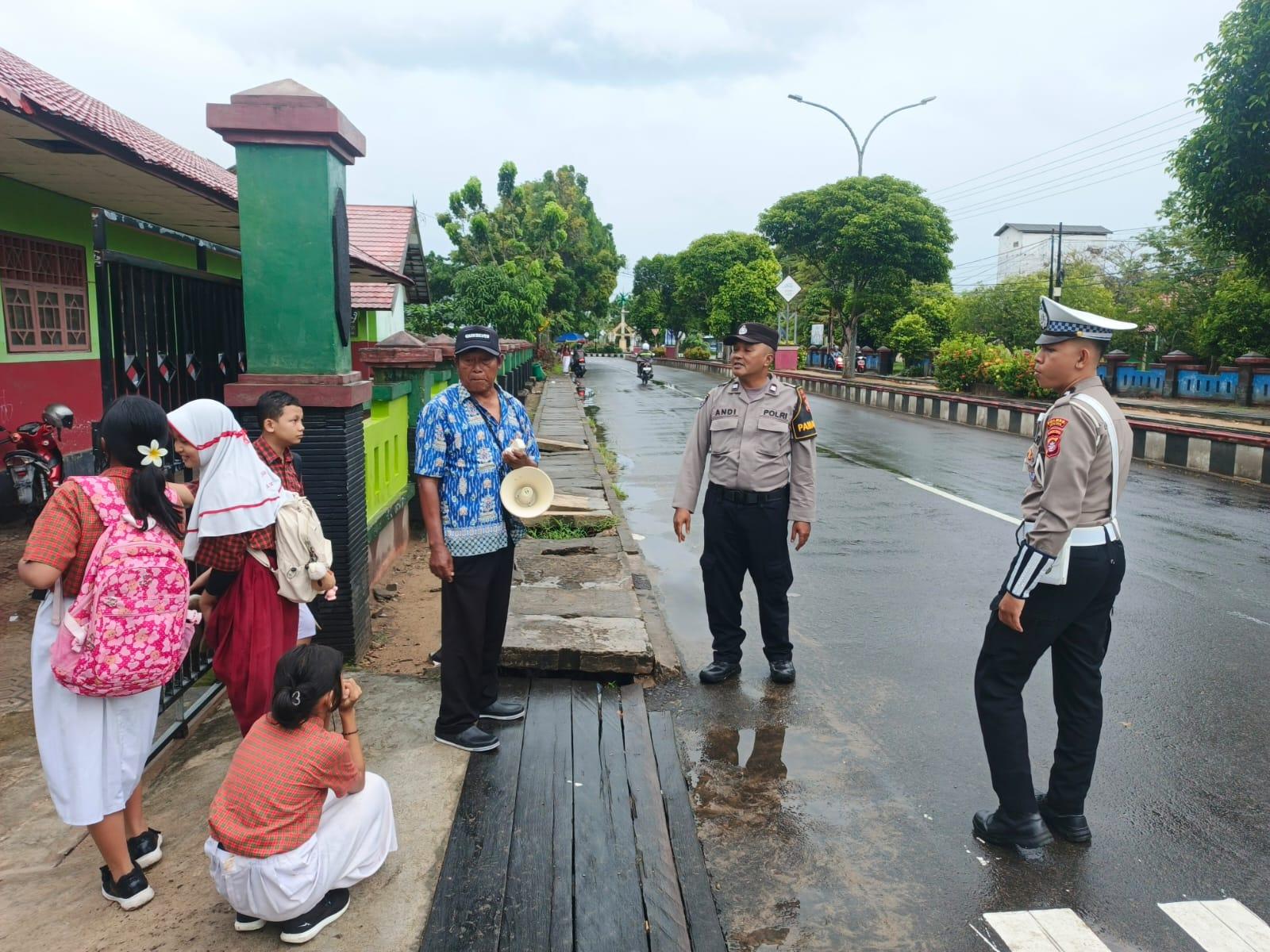 Personel Pamapta III Polres Seruyan, AIPTU Andi Sugiyanto, dengan sigap membantu para siswa yang hendak pulang sekolah, Kamis (30/4/2026). Sejak pukul 11.30 WIB, ia telah bersiaga di Jalan A. Yani, Kuala Pembuang, Kecamatan Seruyan Hilir, Kabupaten Seruyan.
