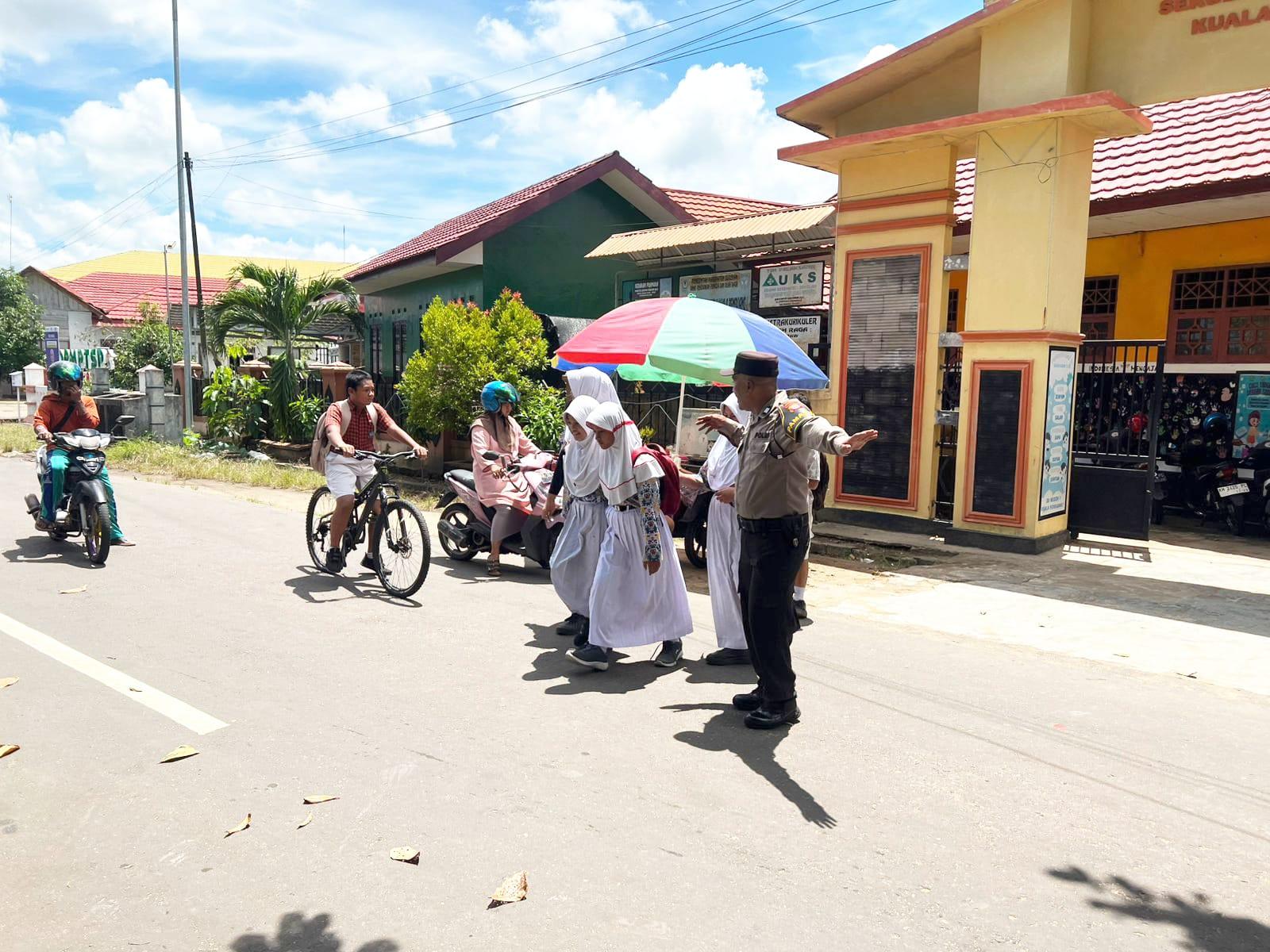Dalam pelaksanaannya, petugas kepolisian mengatur arus kendaraan yang melintas di sekitar sekolah, membantu siswa menyeberang jalan, serta memastikan proses penjemputan berjalan tertib dan aman.