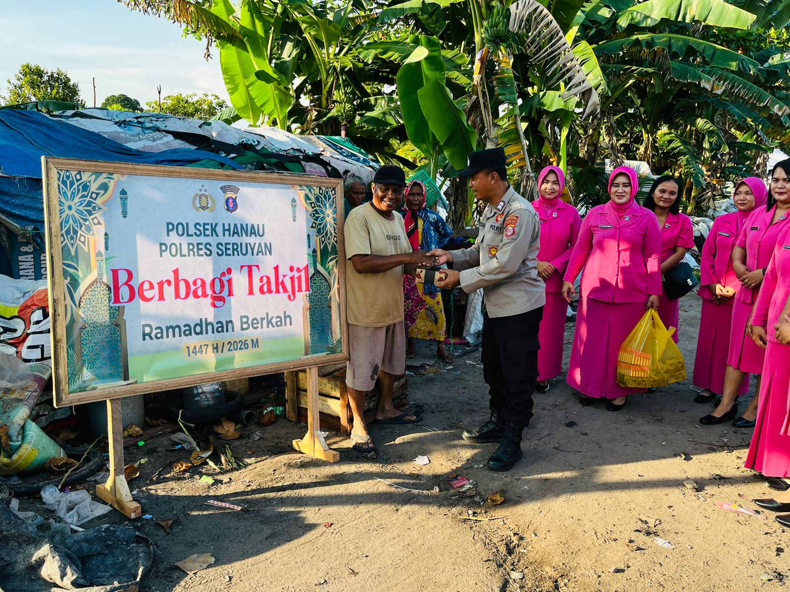 Dalam rangka menyemarakkan bulan suci Ramadhan 1447 Hijriah dan mewujudkan kepedulian sosial kepada masyarakat yang membutuhkan, jajaran Polsek Hanau Polres Seruyan bersama Bhayangkari Ranting Hanau melaksanakan kegiatan pembagian takjil kepada kaum dhuafa. Kegiatan yang berlangsung pada Jumat, (06/3/2026), mulai pukul 16.00 WIB ini bertempat di Jalan Bakrie Entong Gang Mawar, Kecamatan Hanau, Kabupaten Seruyan.