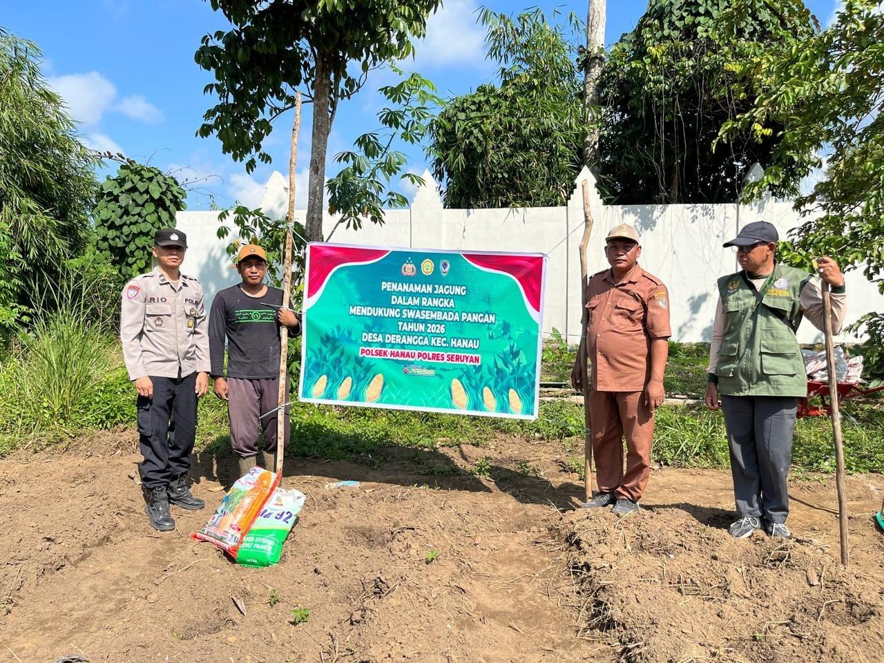 Aipda Rio Bayu P.S. (Polisi Penggerak Desa Derangga) bersama Pemerintah Desa dan warga melaksanakan penanaman jagung program 1 Desa 1 Hektar di lahan Pondok Pesantren An-Nur, Jalan Agung RT. 01, Desa Derangga, Kecamatan Hanau, Kabupaten Seruyan, pada Selasa (21/4/2026) mulai pukul 08.30 WIB hingga selesai. Kegiatan ini dalam rangka mendukung swasembada pangan Tahun 2026.