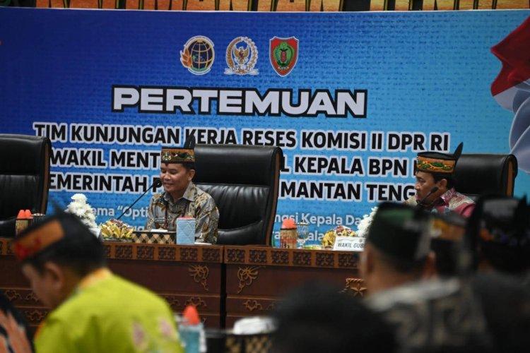 Tim Kunjungan Kerja Reses Komisi II DPR RI menggelar pertemuan bersama Wakil Menteri Agraria dan Tata Ruang/Badan Pertanahan Nasional (ATR/BPN) RI serta Pemerintah Provinsi Kalteng di Aula Jayang Tingang, Lantai II Kantor Gubernur, Kamis (23/4/2026). Pertemuan ini merupakan bagian dari agenda Kunjungan Kerja Reses Komisi II DPR RI Masa Persidangan IV Tahun Sidang 2025–2026.