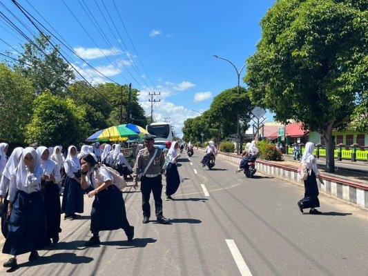 Personel Satlantas tampak sigap mengatur arus kendaraan yang cukup padat pada jam pulang sekolah, sekaligus membantu para siswa menyeberang jalan dengan aman. Kehadiran polisi di lokasi juga bertujuan untuk mencegah terjadinya kemacetan maupun kecelakaan lalu lintas yang rawan terjadi di kawasan sekolah pada jam sibuk.