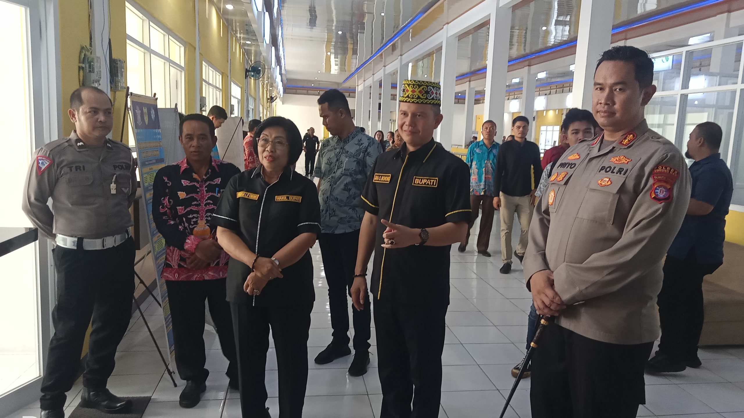 Bupati Gumas Jaya Samaya Monong didampingi Wabup Efrensia L.P Umbing, Kapolres AKBP Theodorus Priyo Santosa dan Kepala DPMPTSP Harpaseno meninjau gerai yang ada di MPP usai soft launching MPP, Sabtu (25/5/2024). (Media Dayak/Novri JKH)