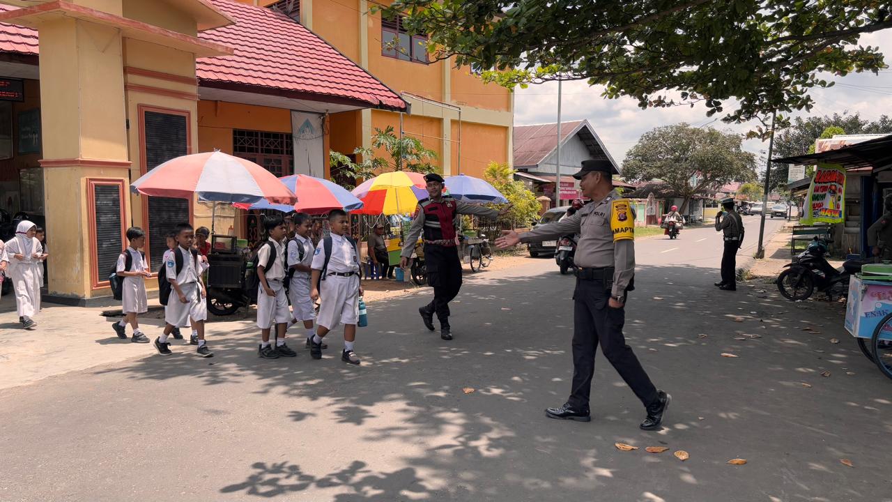 Petugas turut membantu menyeberangkan para siswa dan masyarakat pengguna jalan guna memastikan keselamatan mereka saat melintas di depan sekolah. Kehadiran personel kepolisian di tengah aktivitas masyarakat tersebut merupakan wujud nyata pelayanan Polri dalam menciptakan situasi lalu lintas yang aman, tertib, dan lancar.