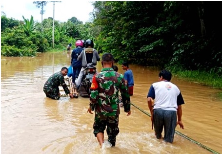 Beberapa orang Babinsa Koramil 1013-01/Kandui dengan rasa peduli membantu warga sekitar dengan membuat rakit bambu untuk penyebrangan dan juga membantu menyebrangkan warga masyarakat yang akan melintasi akses jalan tersebut.